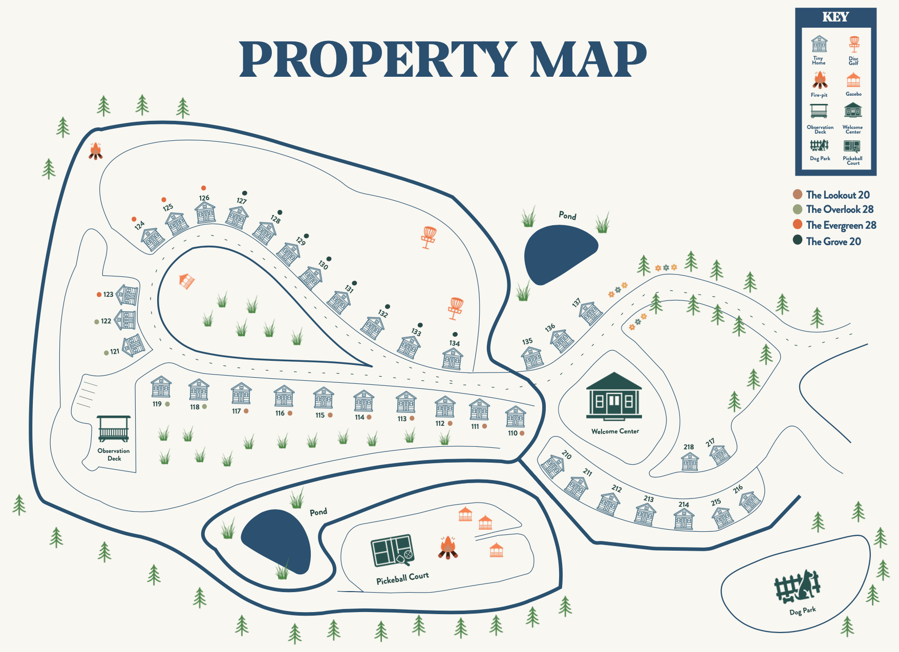 To help guests make the most of their stay, we’ve included a detailed property map that shows the layout of our tiny home community. The map highlights the location of each unit type—The Evergreen 28, The Grove 20, The Overlook 28, and The Lookout 20—making it easy for guests to find their home away from home. It also marks key amenities like the pickleball court, community fire pits, observation deck, Welcome Center, dog park, and walking trails. This map is a helpful tool for planning your stay and discovering everything Sojourn Lodging has to offer.